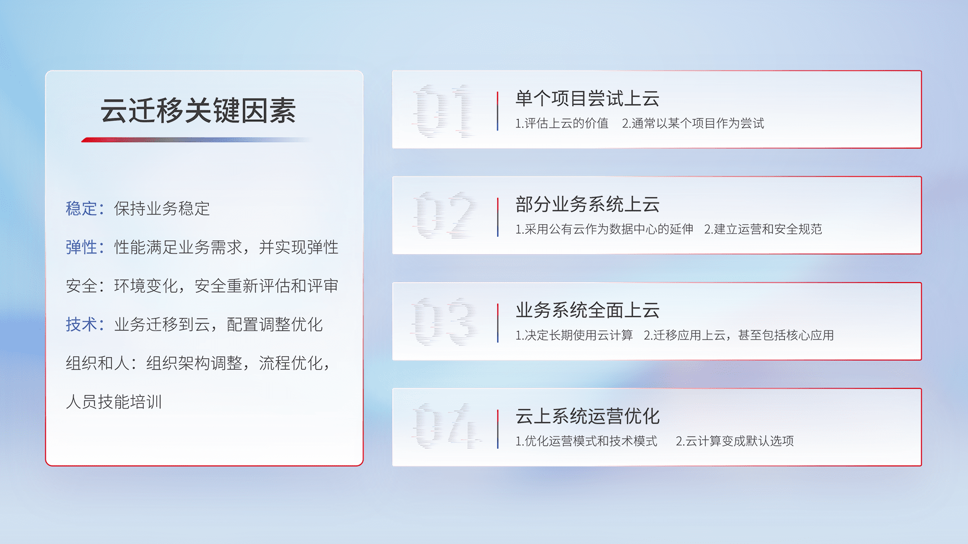 结合实际业务,,,,从规划设计、、云平台选型、、云原生改造、、、、数据迁移、、、集成交付,,迁移全过程为客户识别最佳上云路径,,做好风险识别管理,,设计网络架构、、、身份权限、、、、安全审计合规、、、、操作审计、、、、日志审计、、、、监控告警策略、、多站点容灾设计等,,对云上基础设施进行整体规划,,,,提升IT治理水平,,,以满足弹性、、、、高可用、、、、高性能的需求。。。